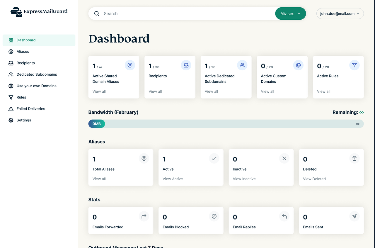 - Centralized Dashboard: A dedicated interface at app.expressmailguard.com allows you to track forwarded mail, see which aliases are active, and review blocked messages.